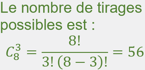 Une urne contient 5 boules blanches, 3 boules rouges toutes indiscernables au toucher. On tire simultanément trois boules dans l’urne. Quel est le nombre de tirages possibles ?