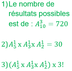 2.Quel est le nombre de résultats donnant dans cet ordre une boule blanche, une boule verte puis une boule bleue ?