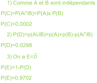 Les probabilités des événements A et B sont respectivement P(A)=0 ,02 et P(B)=0,01. On suppose que ces deux événements sont indépendants.