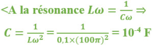 Un dipôle (R,L,C) renferme une inductance pure L=0,10H, une résistance et un condensateur de capacité variable C. La tension délivrée par le générateur est Quelle valeur faut-il donner à C pour qu’il ait résonance d’intensité ?
