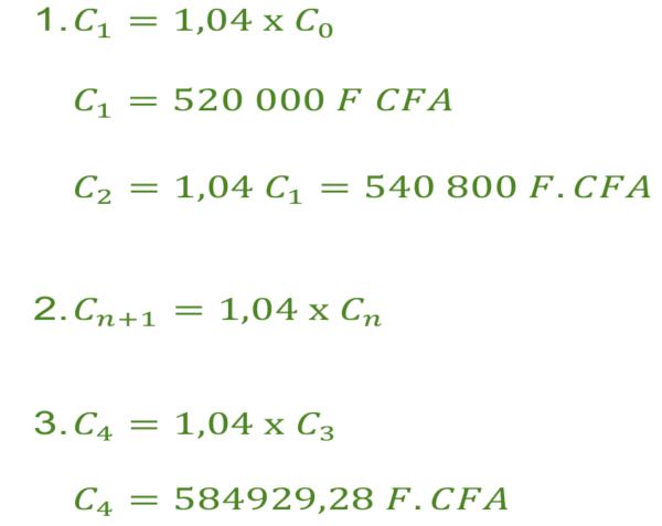 Le chiffre d’affaires d’une entreprise augmente de 4% par an. En 2018 ce chiffre est de 500 000F pour n ∈ IN, on note Cn le chiffre d’affaires de l’année 2018+n.