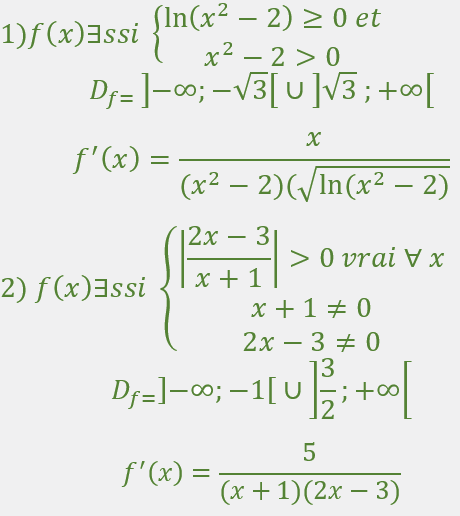 QUESTION 22Détermine l’ensemble de définition et leur délivrée des fonctions suivantes :QUESTION-22-Fonction Logarithme Népérien (Tle S)Résoudre dans IR, les équations suivantes : RETOUR AUX QUESTIONS Afficher la réponse Retour aux Questions Retour aux Chapitres Retour aux Matières