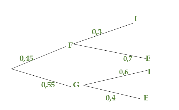 Dans un lycée 45% des élèves sont des filles, 55% des garçons. Parmi les filles 30% sont internes et 70% externes. Parmi les garçons 60% sont internes et 40% externes. Représenter cette situation par un arbre pondéré.