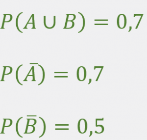 Soient A et B deux événements d’un espace probabilisé (Ω;P(Ω):p), tels que : p(A)=0,3 ; p(B)=0,5 et p(A∩B)=0,1. Calculer la probabilité des événements suivants A∪B ;