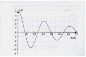 Une bobine d’inductance L et de résistance R est associée à un condensateur de capacité C (préalablement chargé). La courbe indiquée traduit la variation de la tension aux bornes du condensateur en fonction du temps à la fermeture du circuit. Les oscillations observées sont-elles libres ? Sont-elles amorties ?