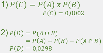 On prélève un sac au hasard dans la production d’une journée. On note A l’événement «le sac présente le défaut a» et B l’événement «le sac présente le défaut b». Les probabilités des événements A et B sont respectivement P(A)=0,02 et P(B)=0,01. On suppose que les événements sont indépendants.