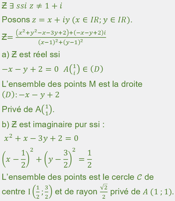QUESTION 52Détermine l’ensemble des points de M(z) tels que : Soit :a) réelb) imaginaire purQUESTION-52-Les nombres complexesDétermine l’ensemble des points de M(z) tels que : Soit :a) réelb) imaginaire pur RETOUR AUX QUESTIONS Afficher la réponse Retour aux Questions Retour aux Chapitres Retour aux Matières