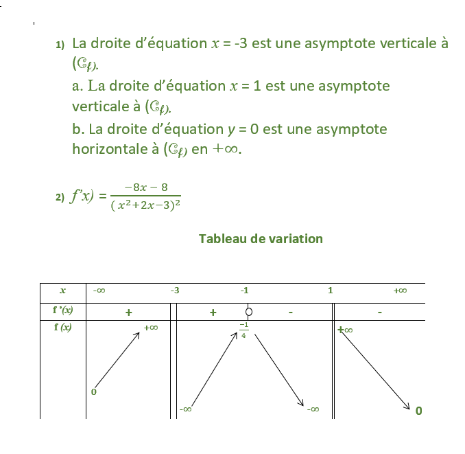 b- Etudier les limites de f aux bornes de . Préciser les asymptotes de ;