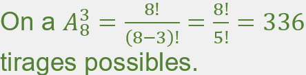 Une urne contient 5 boules blanches, 3 boules rouges toutes indiscernables au toucher. On tire successivement sans remise 3 boules dans l’urne. Quel est le nombre de tirages possibles ?